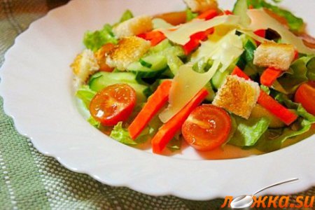 Хлеб режем маленькими кубиками, обжариваем и добавляем в салат.