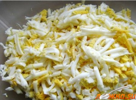 Яйца варим, остужаем, чистим, трем на крупной терке.
