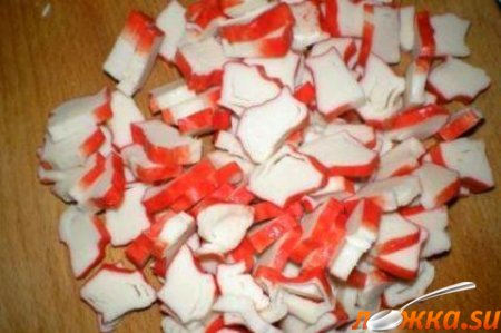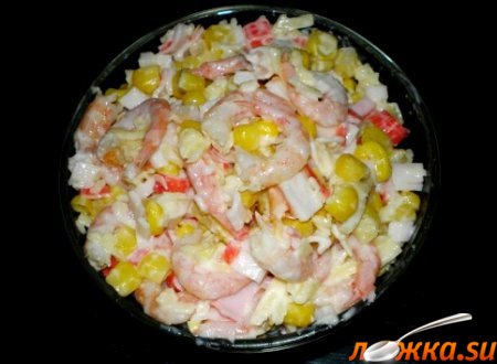 Соединяем крабовые палочки, яйца, креветки, кукурузу. Заправляем майонезом и перемешиваем.