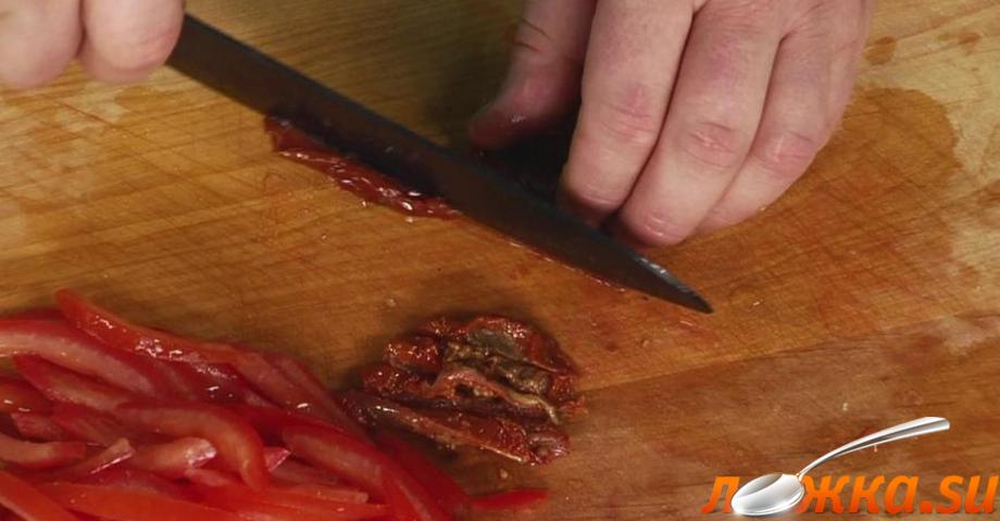 Все томаты чистим и нарезаем. Помидоры черри – на четверти. Из крупных помидоров удаляем семена и режем соломкой. Вяленые томаты также нарезаем соломкой.