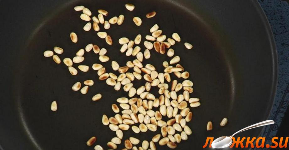 Базилик и укроп шинкуем, отправляем в блендер. Немного укропа откладываем. Кедровые орешки обжариваем на сухой сковороде.