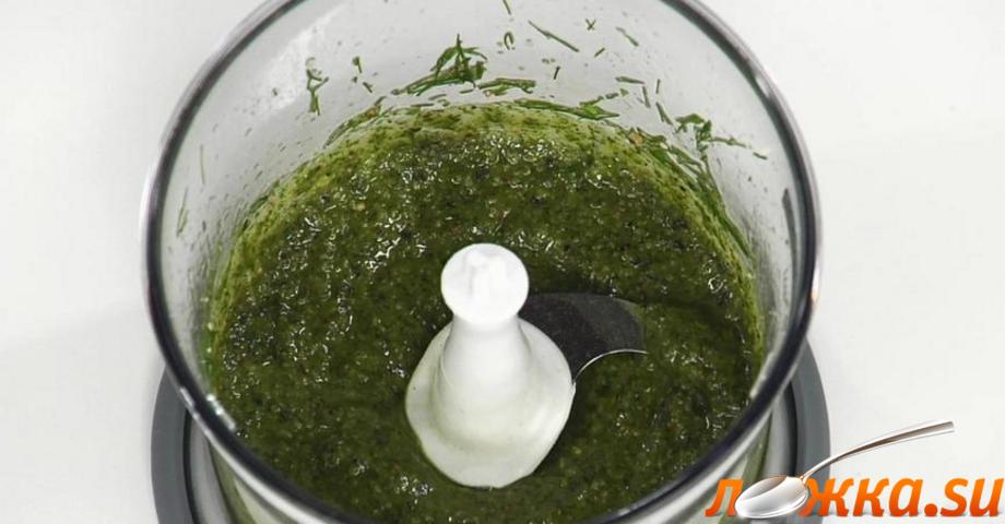 Зелень, орешки и сыр укладываем в блендер, чуть солим и сдабриваем маслом. Взбиваем песто.
