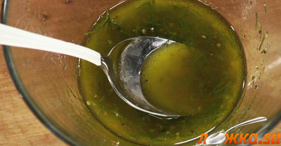 Из лайма отжимаем сок, добавляем укроп, сахар, перец и чуть-чуть соли. Все перемешиваем с оливковым маслом.