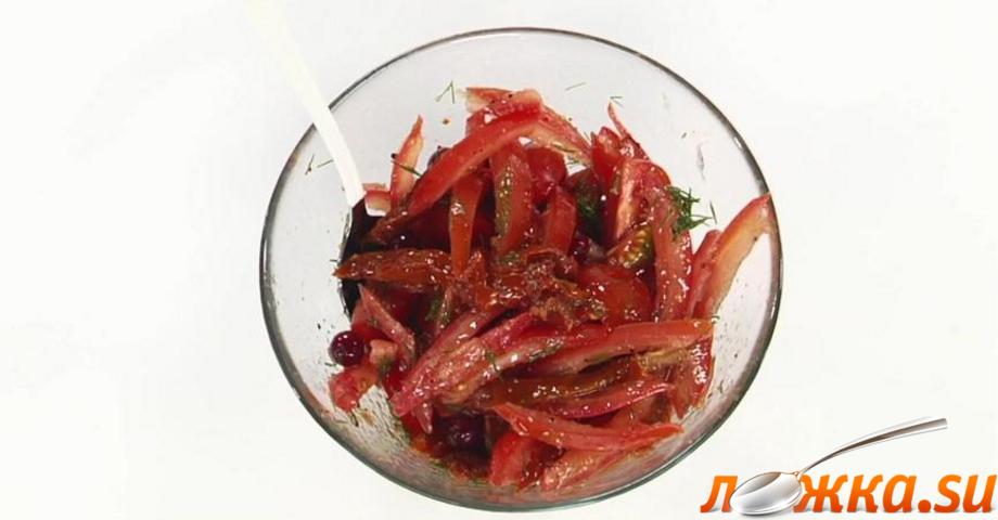 Томаты и клюкву заправляем получившимся маринадом и даем настояться 3 минуты.