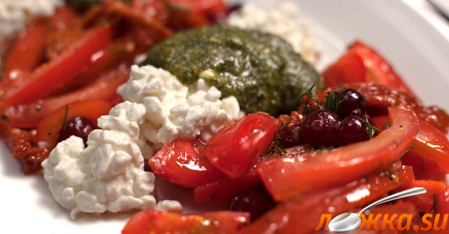 Выкладываем томаты на тарелку, чередуя с зернистым творогом. Добавляем песто.
