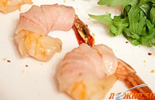 Извлеченные из маринада креветки завернуть в полоски бекона, выложить их на решетку.