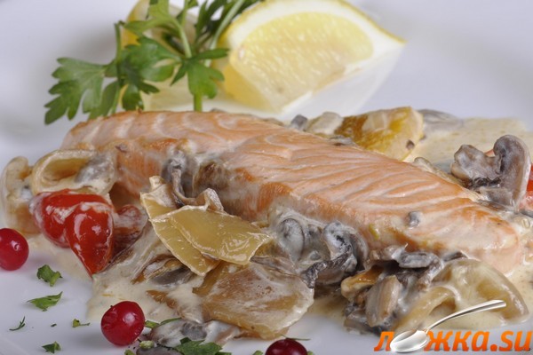 Смешать сметану с солью, перцем, специями, разбавить водой, добавить обжарку. Соус прогреть до загустения. Форель поставить в духовку на 15 минут, печь при температуре 220 градусов. Блюдо вынуть, полить грибным соусом, посыпать сыром. Печь форель под грибным соусом в течение 15 минут.