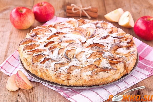 Выложить фрукты в форму, смазанную маслом и присыпанную сухарями. Если использовать силикон – такую подготовку делать не нужно. Посыпать начинку молотой корицей. Залить тестом, печь при температуре 180 градусов. Время приготовления – около 45 минут. Сладкую шарлотку остудить.