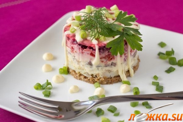 Далее – слой моркови, также нарезанной кубиками, майонез, кубики свеклы, майонез. Форму снять, бока получившейся башенки посыпать зеленым луком, украсить лосось под шубой веточками петрушки и укропа.