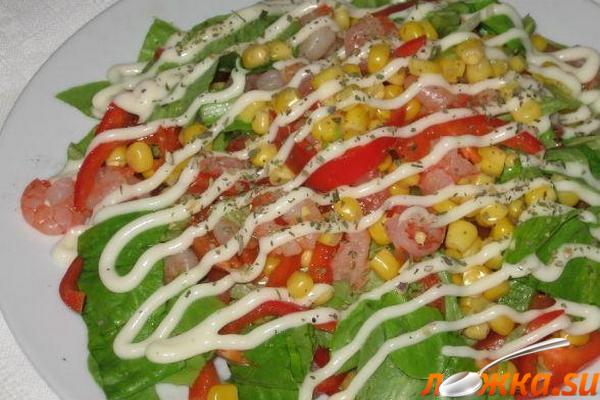 Очистить от семенных камер сладкий красный болгарский перец, нарезать тонкими ломтиками. Крупно нарезать хорошо вымытый зеленый салат. От консервированной кукурузы отцедить жидкость.
