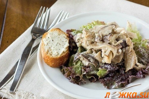 Влить 1/4 часть сливок, сдобрить солью и специями, готовить еще 5 минут. Приготовить заправку. Для этого в миску поместить масло, сливки и уксус, все перемешать, посолить. В заправку добавить листья салата, перемешать. Листья выложить в сервировочное блюдо, сверху уложить готовые грибы.