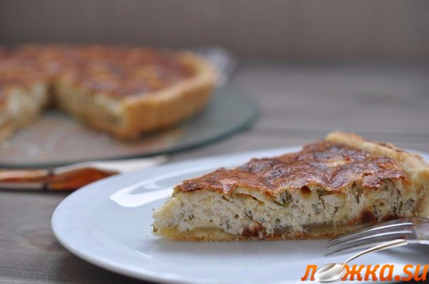 Присыпать стол мукой, раскатать тесто в пласт, перенести на скалке в форму, прижать к дну и бортикам, излишки теста срезать. Поставить минут на 5-7 форму в холодильник. Достать, заполнить подготовленнной начинкой, отправить куриный киш с сыром в духовку. Готовить до зарумянивания сыра.
