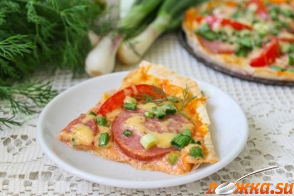 Смазать смесью кетчупа с майонезом, присыпать опять 1/3 частью сыра, на него уложить кружочки копченой колбасы, на нее – помидоры, присыпать нашинкованным зеленым луком, завершить все слоем оставшейся сырной стружки. Отправить эконом пиццу на лаваше минут на 7 в духовку, достать, нарезать, присыпать пряной зеленью (по желанию), сразу подать к столу.