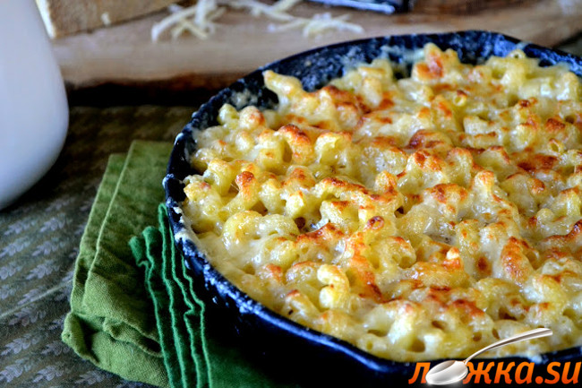 Форму смазываем маслом, выкладываем 1/3 подготовленных макарон, равномерно распределяем 1/3 сливочного масла и посыпаем 1/3 подготовленным сыром. Повторяем слои из макарон, сыра и сливочного масла ещё 2 раза и заливаем молоком со сливками.