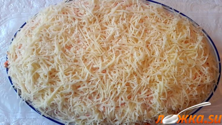 Потом мелко нарезанная морковь по корейски и снова смазываем майонезом.