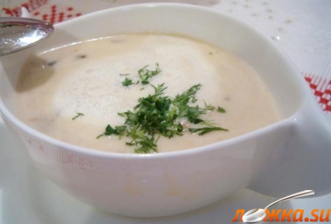Порезать шампиньоны, обжарить на растительном масле, в процессе добавить сливки. Можно добавить грибной бульон из кубика или из сушеных грибов. Массу измельчить в блендере, протереть через сито (получается ещё нежнее и вкуснее). Белый хлеб нарезать кубиками 1 см, обжарить на раст. масле. Подавать к супу.