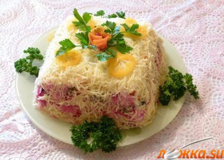 Шаг 8 Выложить на блюдо слоями, в таком порядке: Картофель — Майонез, Лук — Мясо — Майонез, Морковь — Чернослив — Орехи — Морковь — Майонез, Свекла — Майонез, Яйца — Майонез, Сыр.