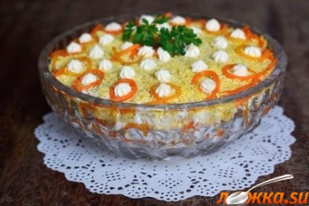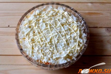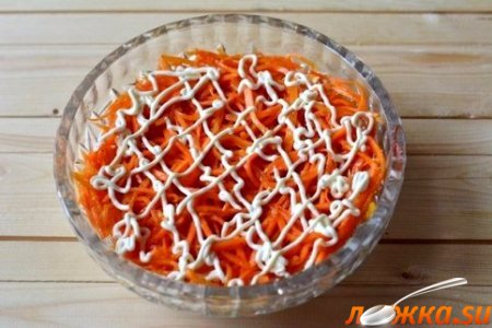 2-й слой : морковь по - корейски, сеточка из майонеза.