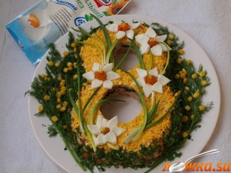Шаг 8 Отделить яичные белки и желтки. Желтки натереть на средней терке и посыпать верх салата. Бока салата - нарезанной мелко зеленью. Затем вынимаем аккуратно стаканы и оформляем нарциссами из яичных белков и моркови. По бокам выкладываем веточки укропа и посыпаем кукурузой.