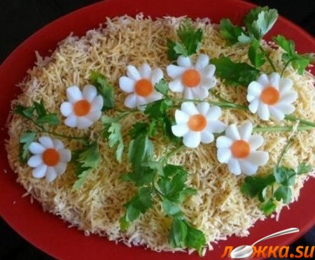 Шаг 5 Украсить зеленью петрушки, яичным белком( вырезать цветочки), серединка цветочка из морковки.
