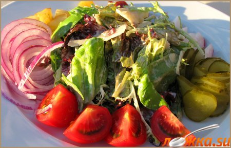 Шаг 4 Вокруг салат выложить обжаренные зальцбургские колбаски, обжаренный отварной картофель, свежие помидоры, редис, соленые огурцы и тонкие кольца красного сладкого лука.