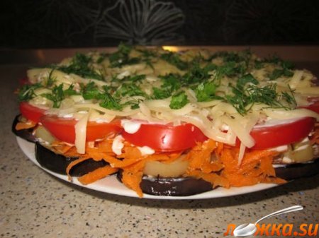 Шаг 7 Салат выложить слоями: баклажаны, болгарский перец, морковь с чесноком, помидоры. Смазать майонезом.