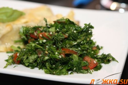 Шаг 1 Хорошенько промыть зелень, отрезать жесткую часть стеблей и немного просушить. Мелко нарезать и переложить в салатник.