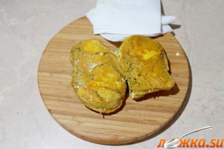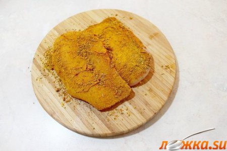 Куриные грудки обильно смазываем специями и оставляем мариноваться минут на 10-15.