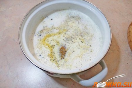 В кастрюле молоко доводим до кипения, добавляем соль, лавровый лист и перец горошком. В кипящее молоко выкладываем грудки в специях и варим ровно 1 минуту! Сразу снимаем кастрюлю с плиты, плотно накрываем крышкой и укутываем теплым пледом. Оставляем в тепле на 2 часа.