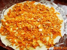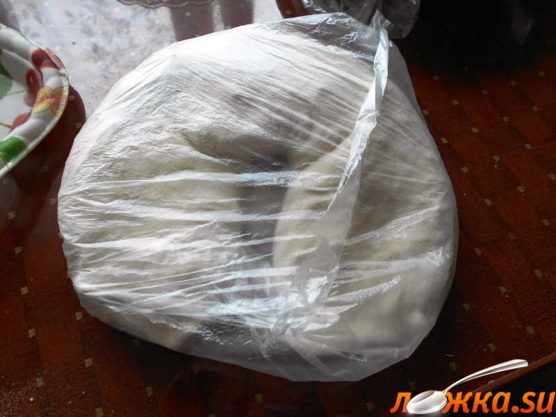 Тесто разделить пополам и раскатать в тонкую лепешку.