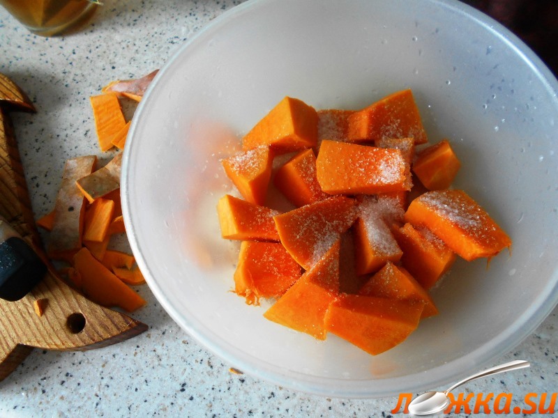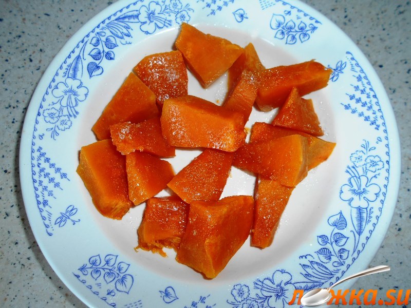 Переложить готовую тыкву на тарелку. Посыпать сахаром (это по желанию) и вновь отправить в печь на минуту.
