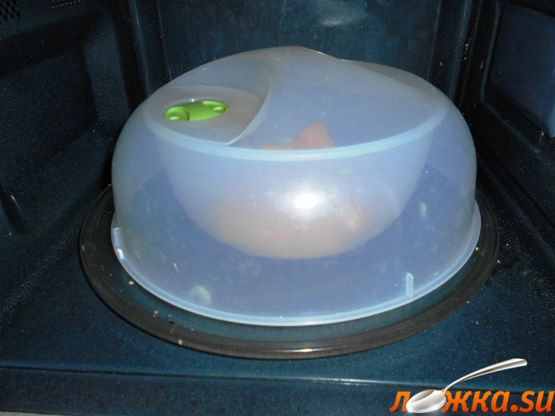 Закрыть крышкой и отправить в микроволновку на 4-5 минут.