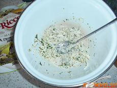 В миску натереть сырок (можно "Янтарь" или любой другой, какой есть). Туда же отправить мелко порезанную зелень и остатки майонеза. Если любите пряности и чеснок, то можно тоже их добавить, ориентируясь на свой вкус. Перемешать.