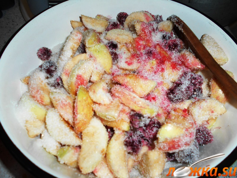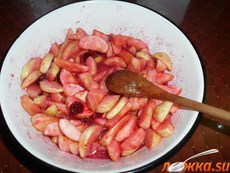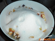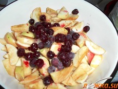 Яблоки брать на свое усмотрение. Сахар +/- в зависимости от сладости яблок. Яблоки порезать на среднего размера дольки. Вишню освободить от косточек (можно не освобождать).