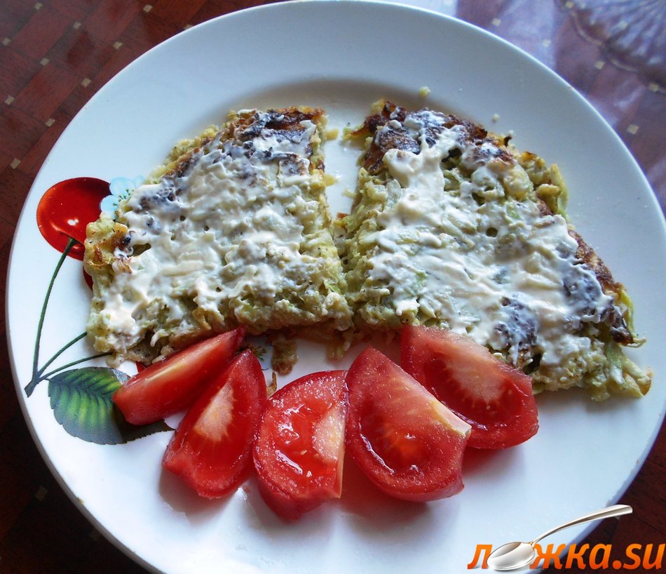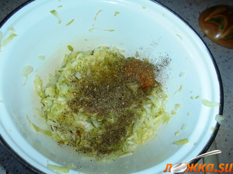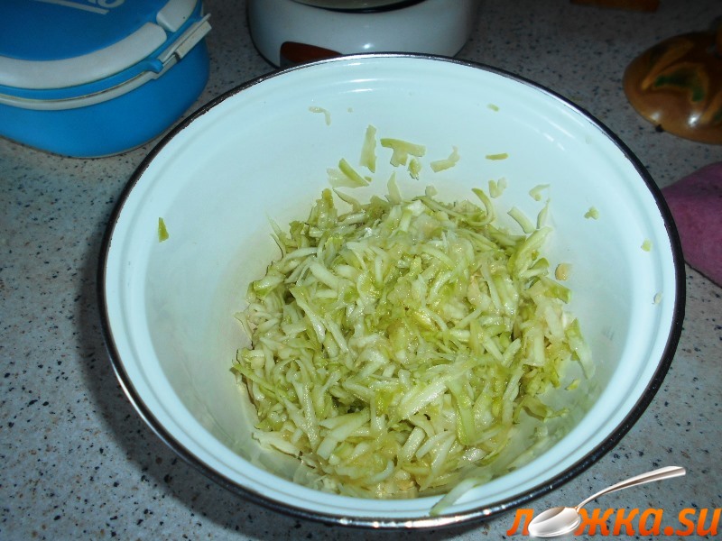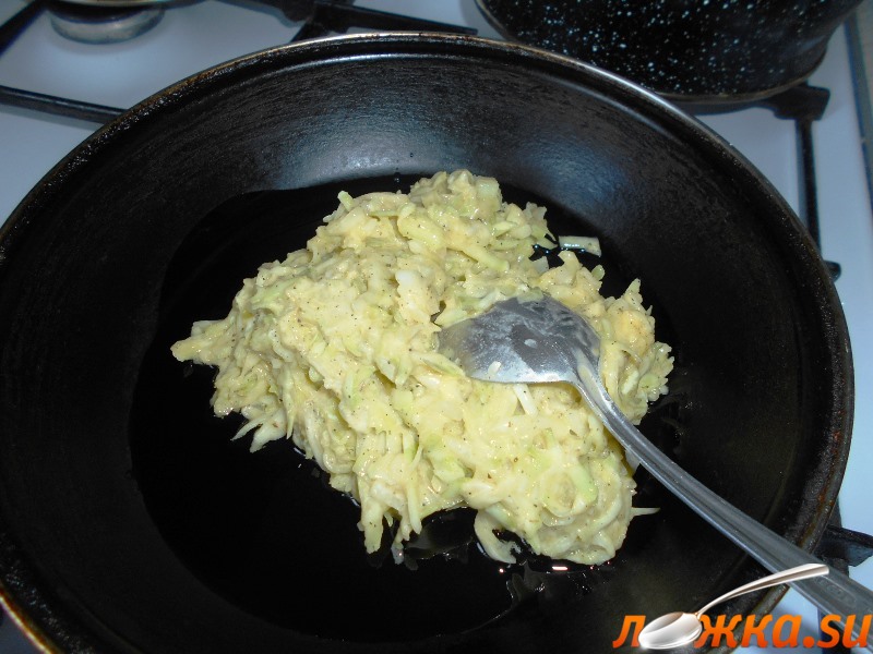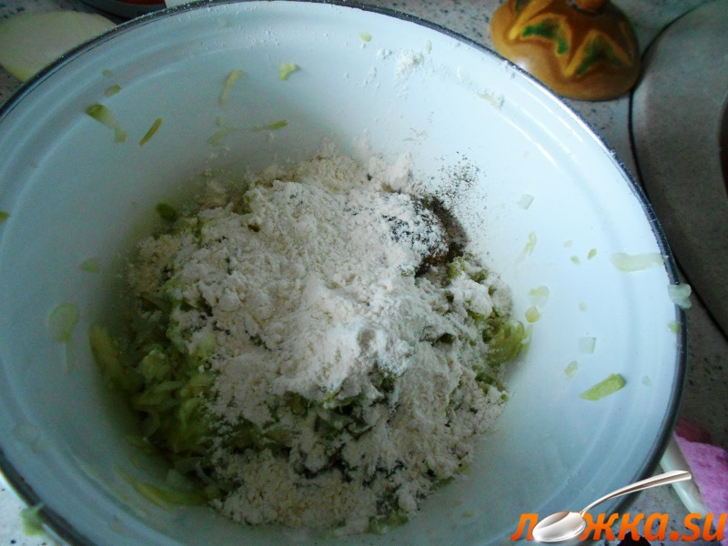 Лук порезать мелкими кубиками - оправить к кабачкам. Вбить яйца, всыпать муку. Хорошо перемешать.