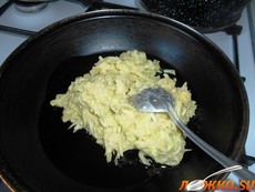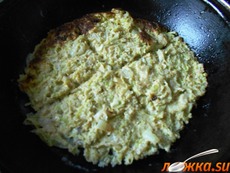 Разровнять ее на сковороде ровным слоем. Поставить на медленный огонь, закрыв крышкой.
