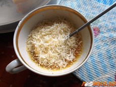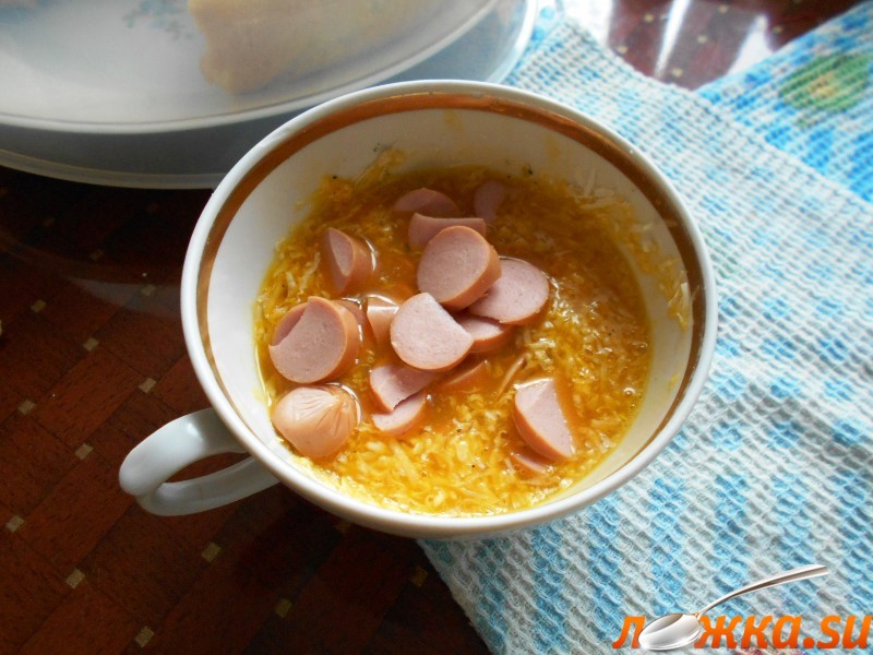 Сыр натереть на терке. Высыпать к яйцам и сосиске.