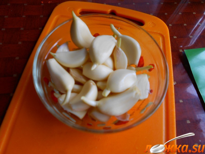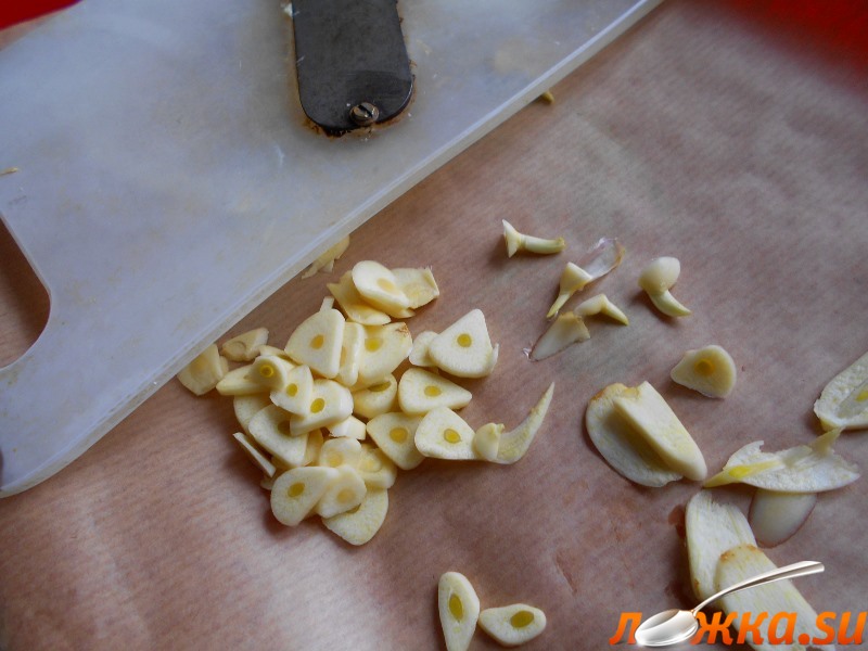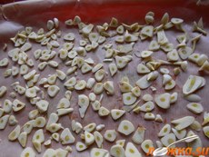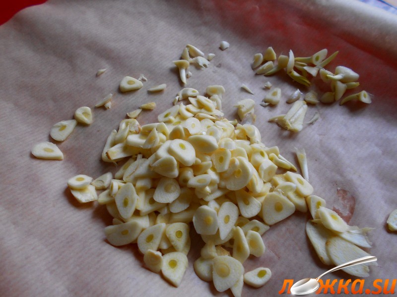Поднос застилаю пергаментной бумагой и высыпаю на него порезанный чеснок.