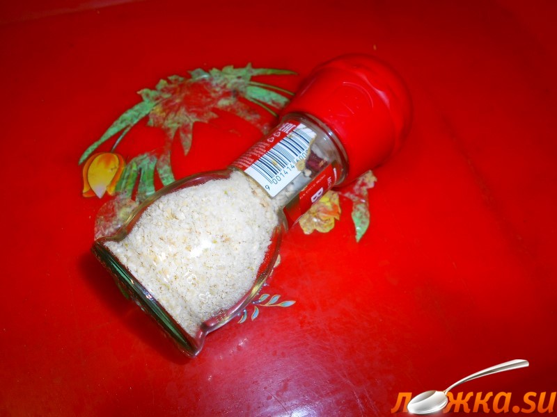 Сохнет чеснок достаточно быстро. Сухой чеснок немного измельчаю в кофемолке, а потом пересыпаю в мельничку.