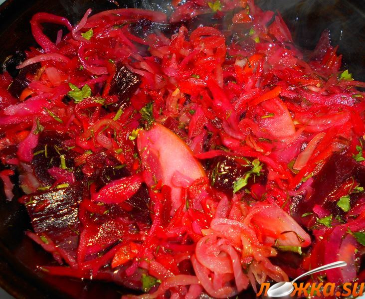 В капусту порезать варенную свеклу (резать на ваше усмотрение). Туда же отправить яблоко, которое квасилось с капустой - порезать. Если нет такого - порезать свежее. Заправить оливковым или другим растительным маслом и хорошо перемешать, чтобы капуста стала красивого красного цвета. Можно добавить зелень на свое усмотрение.