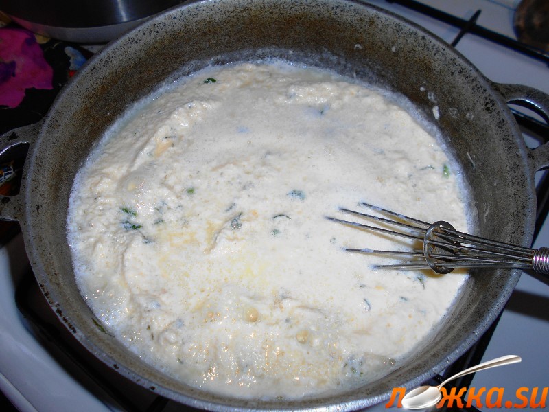 В кипящее молоко, не торопясь, влить яичную массу, помешивая. Молоко на глазах начнет сворачиваться.