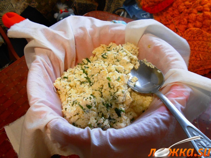 Укрыть будущий сыр концами ткани и поставить на него груз на часик.