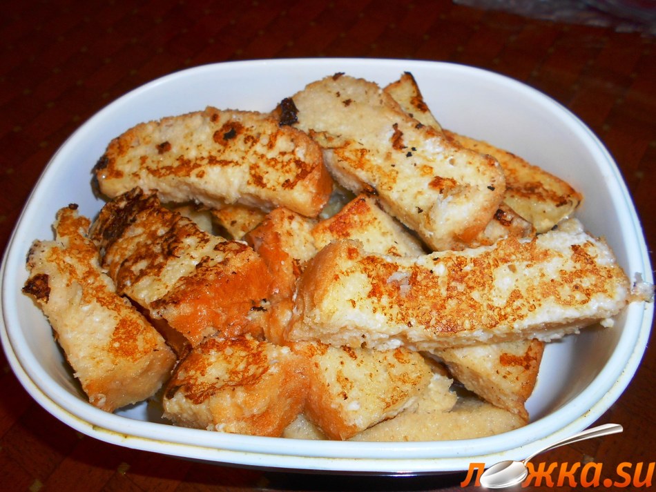 Взбить в удобной посуде молоко с яйцами. Каждый кусочек обмакнуть в массу и обжарить на растительном масле с обеих сторон.