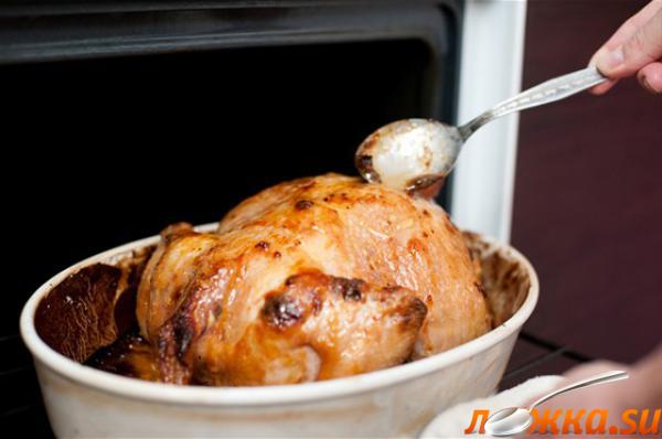 5. Помещаем курицу (все это время она у меня в форме для запекания) в разогретую духовку. Куриные ножки предварительно лучше связать. Я жарю ее примерно час при температуре 180 градусов с одной стороны. В течении этого часа я периодически поливаю курицу соусом из формы. Через час я достаю курицу из духовки, чтобы перевернуть ее. Это не сложно сделать, например, двумя вилками, поддев аккуратно с одной и другой стороны. Перевернули и полили оставшимся соусом. Снова ставим в духовку и жарим еще минут 20–30. В этом случае в ходе жарки, так же 2–3 раза можно полить курицу соусом из формы.