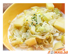 Очистите картофель, промойте и нарежьте. Мелко нарежьте лук-порей, добавьте к картофелю, залейте небольшим количеством молока, добавьте постное масло и соль по вкусу. Варите до мягкости, посыпьте мелко нарезанную зелень лука, доведите до готовности на медленном огне.
