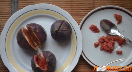 Инжир разрежьте пополам, но не до конца. Аккуратно ложкой вытащите мякоть.