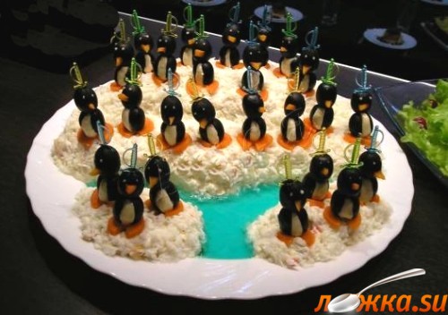 Оформляется салат с языком «Пингвины на льдине» так: пингвинчиков поставить на «айсберг» в произвольном порядке, перед подачей охладить.
