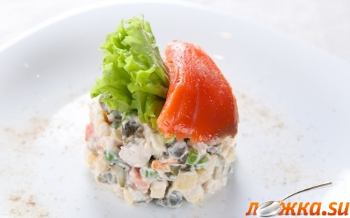 Соединить подготовленные ингредиенты, перемешать, поперчить и посолить, добавить майонез, перемешать и охладить оливье с лососем перед подачей.