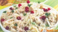 С капусты слить воду, добавить орехи с чесноком, перемешать, заправить салат с вареной капустой майонезом, поперчить, размешать, подавать, оформив зеленью и клюквой.