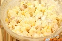 Соединить грибы и овощи с сыром, яйцами и куриным филе, добавить майонез и перемешать.